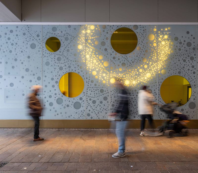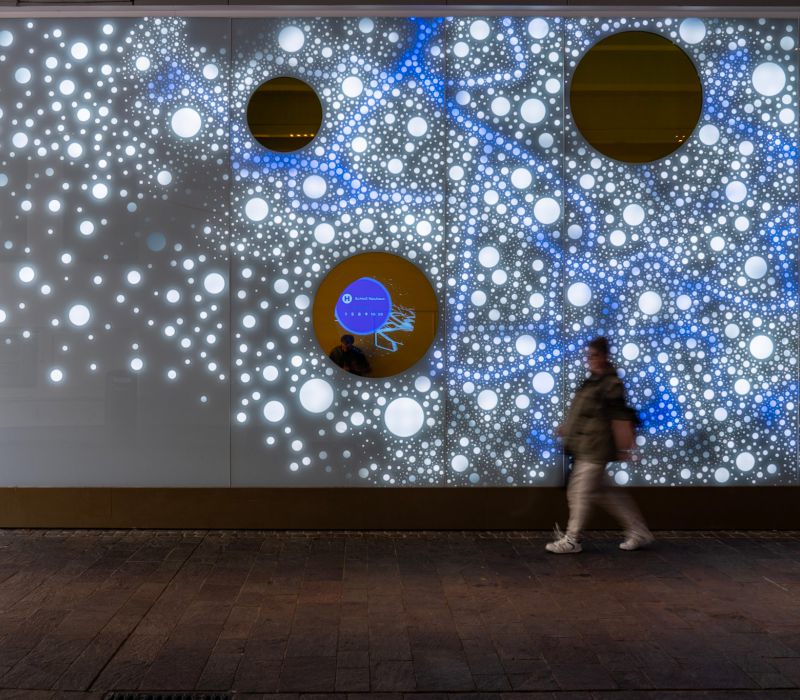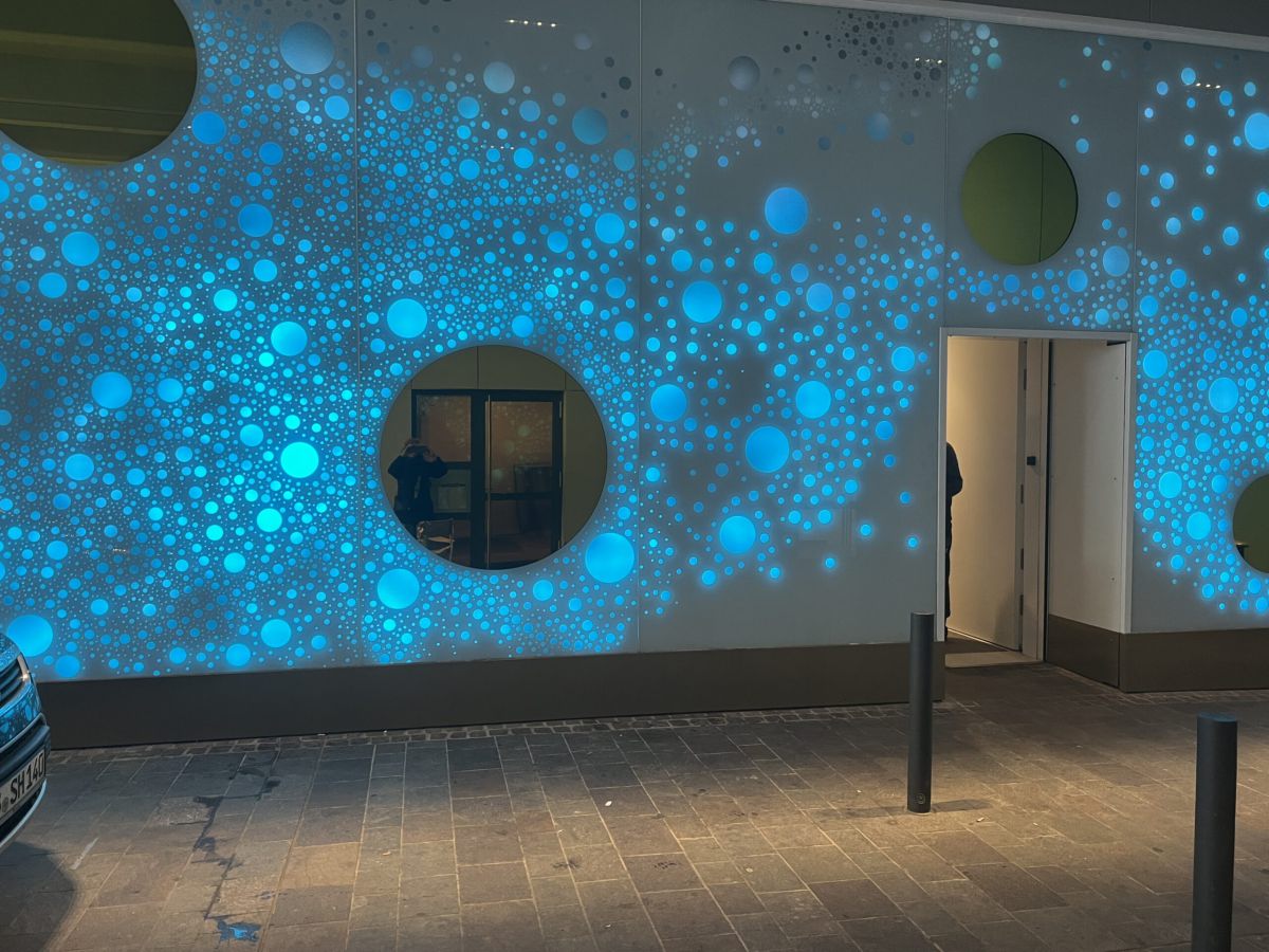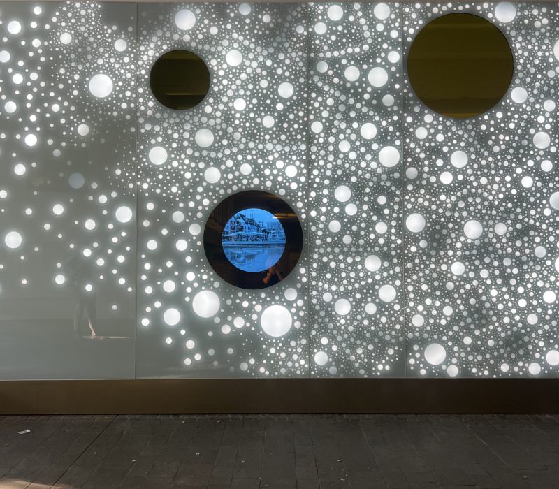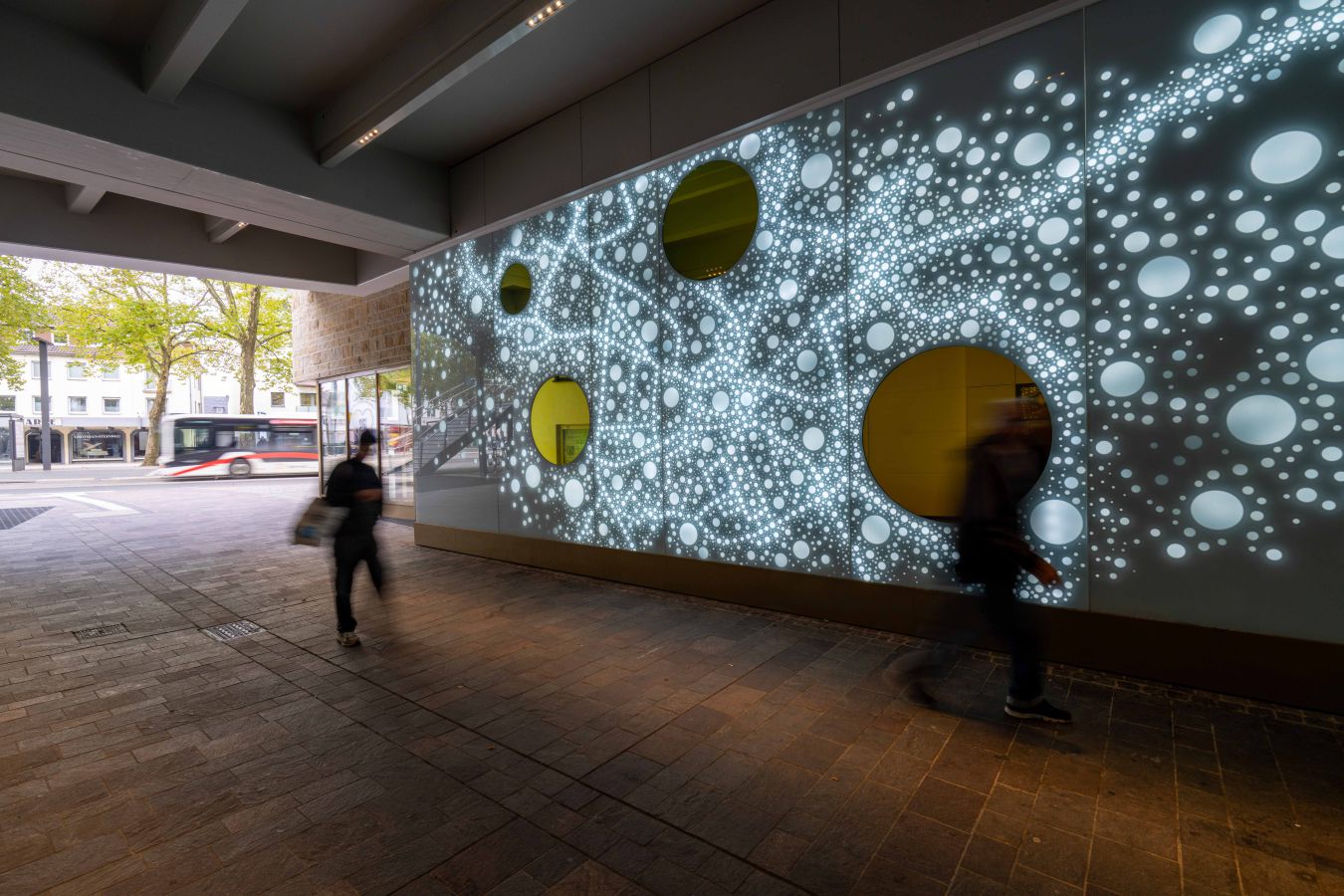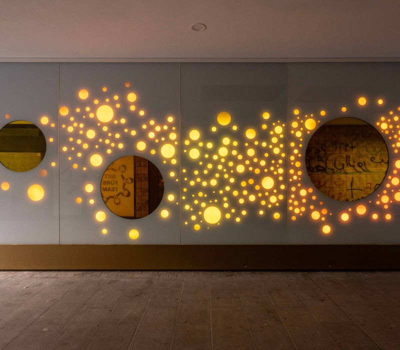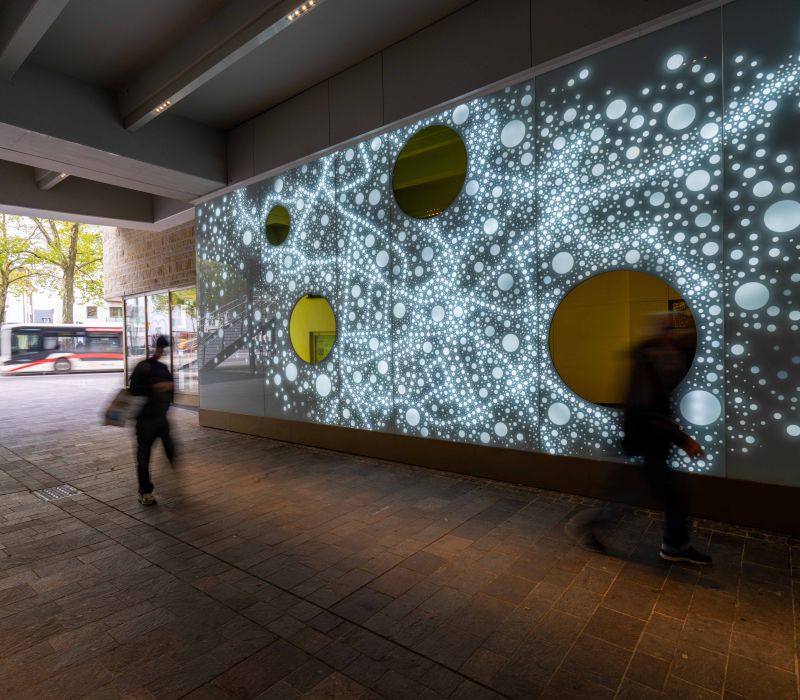 Die Lichtwand auf zwei Etagen der Brückengasse schafft einen Bezug zur Stadt und dem ÖPNV: Stadtplan, Buslinien und wichtige Orte in der Stadt werden verknüpft und all das in eine abstrakte Lichtzeichnung eingebettet, die einer Galaxie ähnelt. „Spots“ – goldene runde Spiegel, bündig in die Glasfläche eingelassen, verbergen Monitore, die bei Annäherung aktiviert werden und kurze Filme zu Hotspots der Stadt zeigen – in Verbindung mit Angaben zu den Buslinien, mit denen man diese Orte erreicht. In der Fläche wechseln weiße mit farbigen Lichtszenen ab – mehr oder weniger dynamisch in Abhängigkeit von Tages- oder Jahreszeit und besonderen Ereignissen. Die dynamische Hinterleuchtung, ein steuerbares LED-Lichtsystem, ermöglicht eine kreative Lichtgestaltung, mit der auch neue Lichtszenen noch Jahre später programmierbar sind.