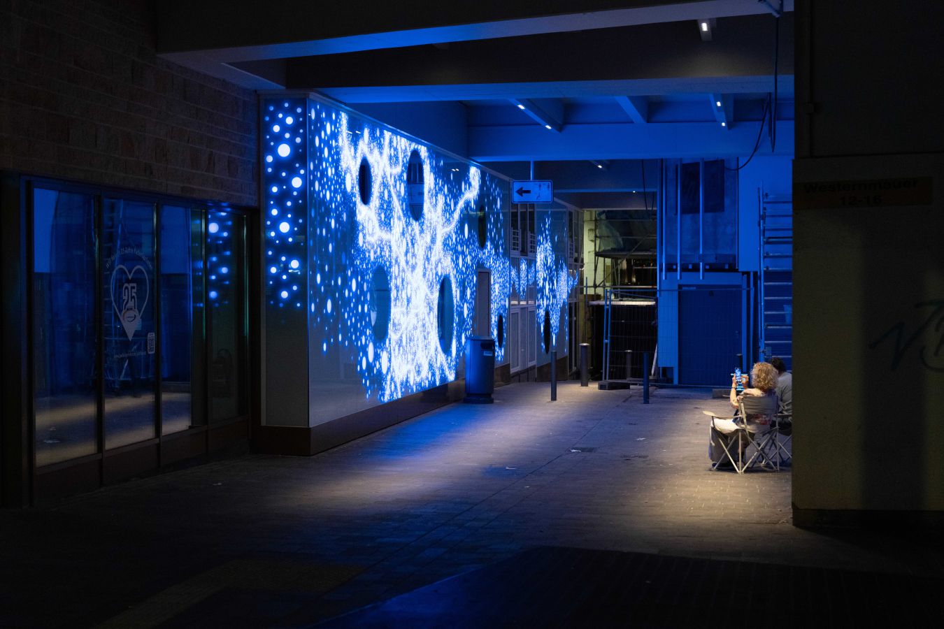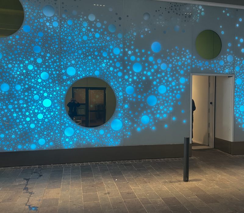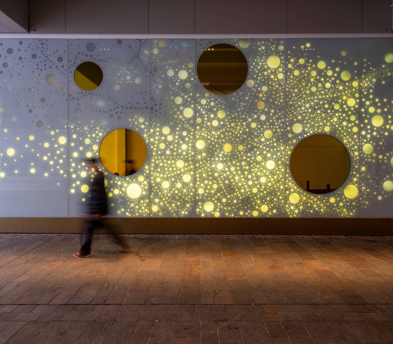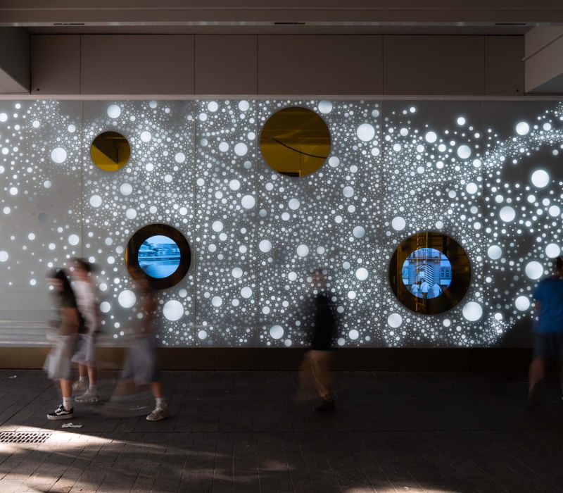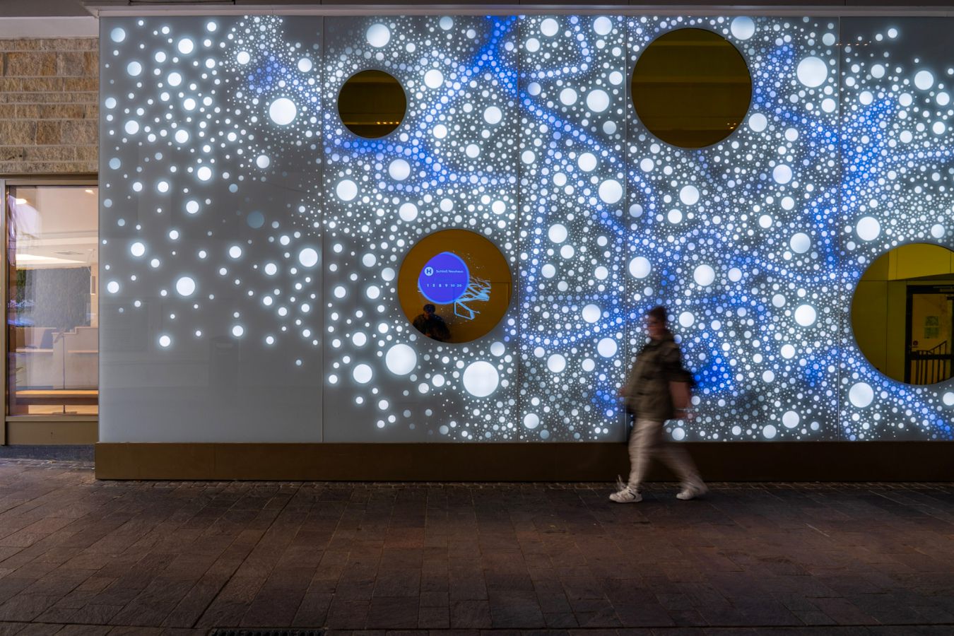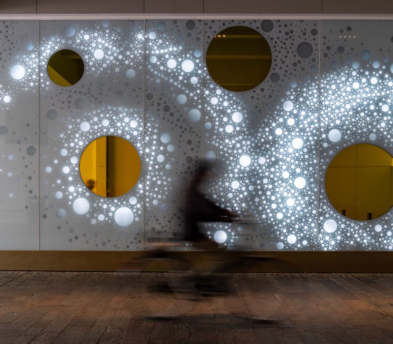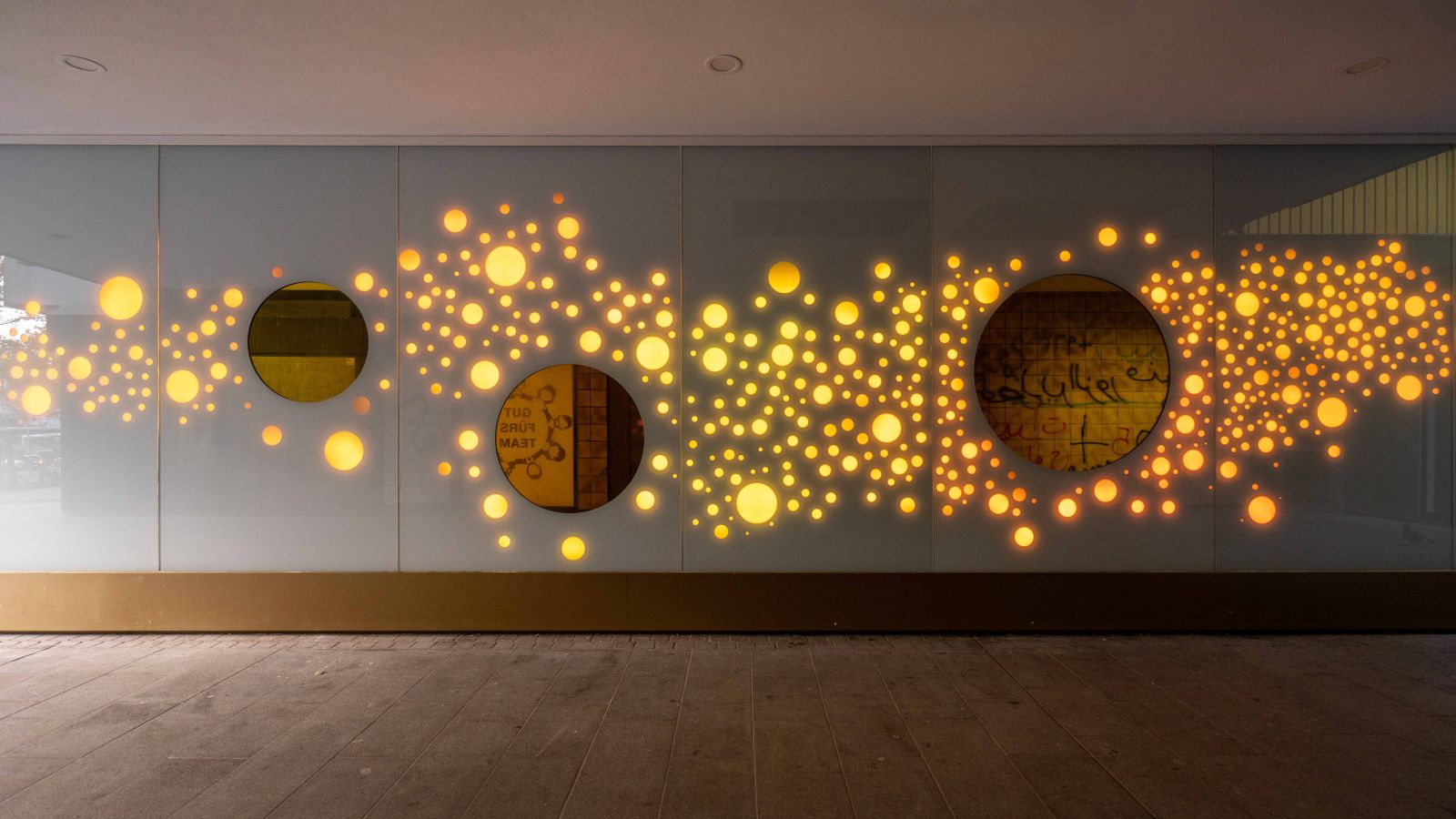 Die Lichtwand auf zwei Etagen der Brückengasse schafft einen Bezug zur Stadt und dem ÖPNV: Stadtplan, Buslinien und wichtige Orte in der Stadt werden verknüpft und all das in eine abstrakte Lichtzeichnung eingebettet, die einer Galaxie ähnelt. „Spots“ – goldene runde Spiegel, bündig in die Glasfläche eingelassen, verbergen Monitore, die bei Annäherung aktiviert werden und kurze Filme zu Hotspots der Stadt zeigen – in Verbindung mit Angaben zu den Buslinien, mit denen man diese Orte erreicht. In der Fläche wechseln weiße mit farbigen Lichtszenen ab – mehr oder weniger dynamisch in Abhängigkeit von Tages- oder Jahreszeit und besonderen Ereignissen. Die dynamische Hinterleuchtung, ein steuerbares LED-Lichtsystem, ermöglicht eine kreative Lichtgestaltung, mit der auch neue Lichtszenen noch Jahre später programmierbar sind.