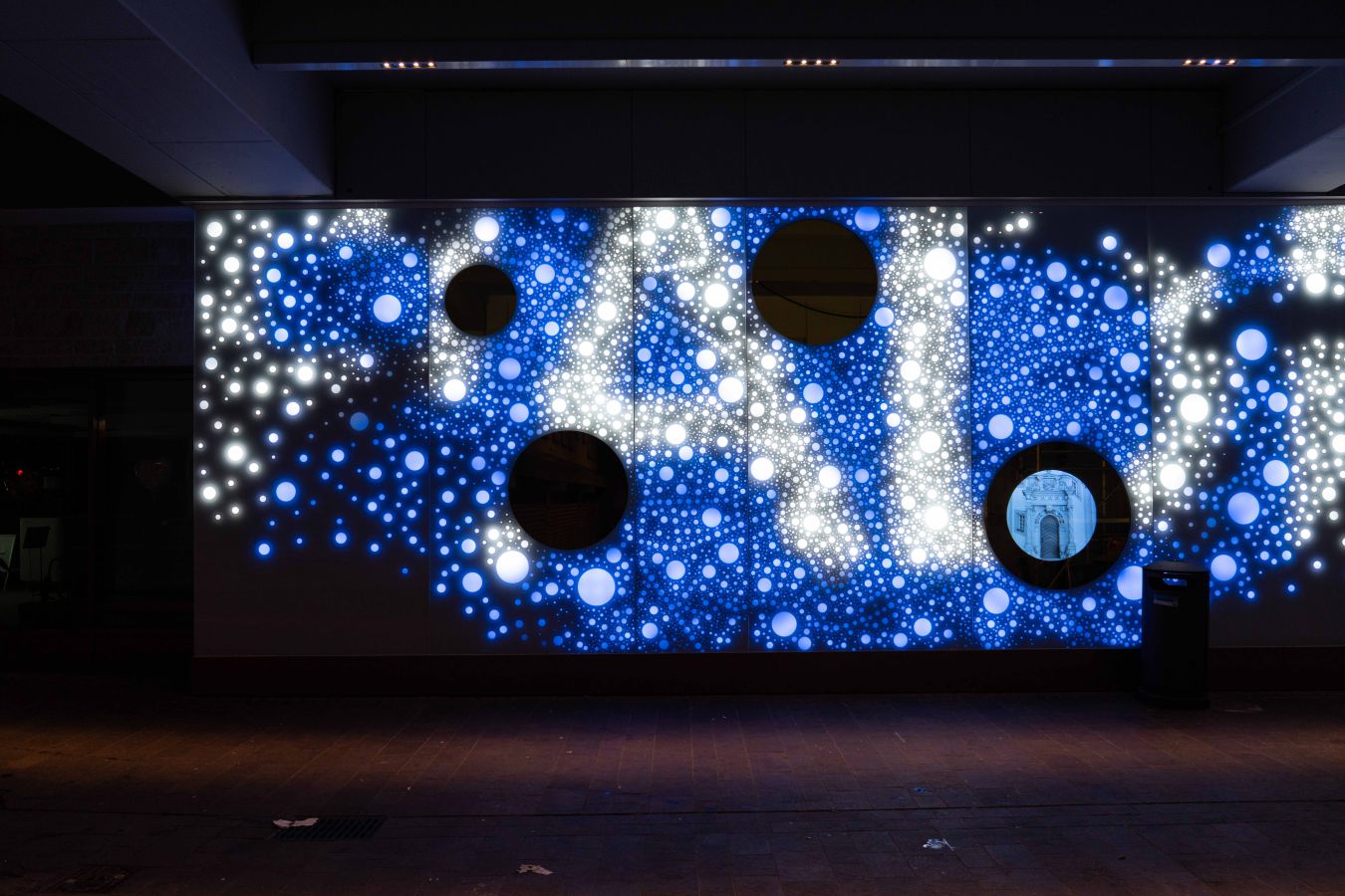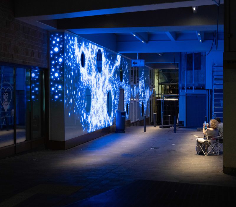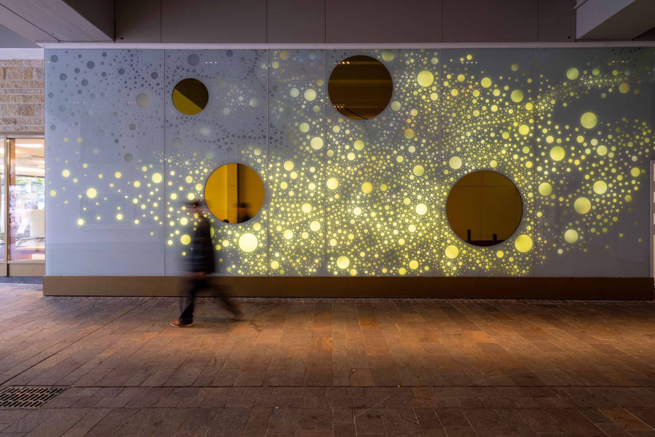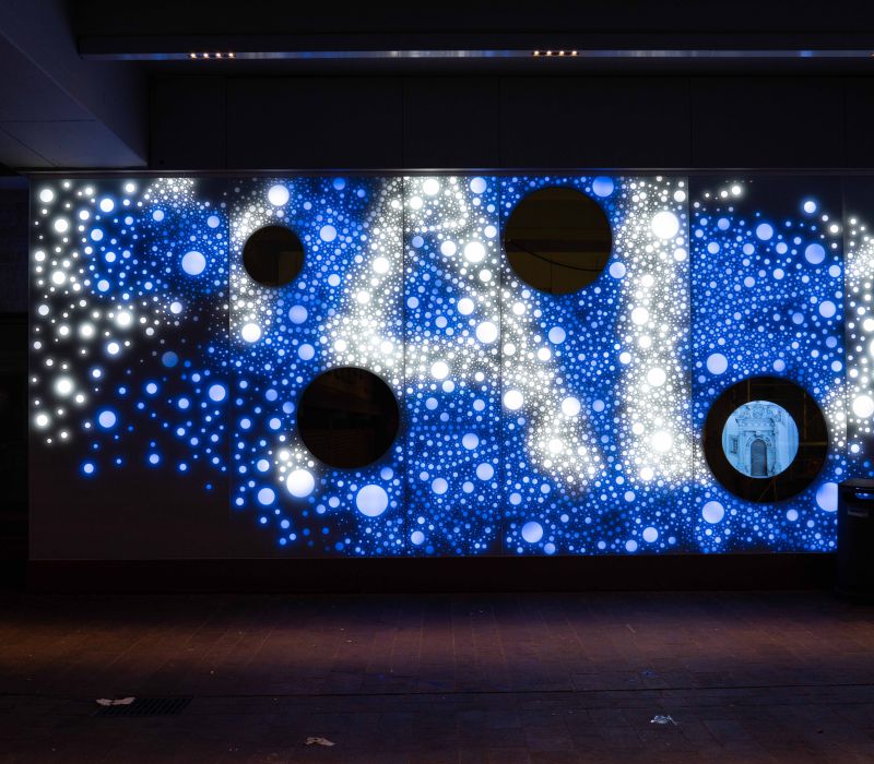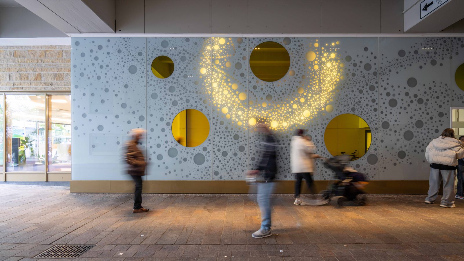 Die Lichtwand auf zwei Etagen der Brückengasse schafft einen Bezug zur Stadt und dem ÖPNV: Stadtplan, Buslinien und wichtige Orte in der Stadt werden verknüpft und all das in eine abstrakte Lichtzeichnung eingebettet, die einer Galaxie ähnelt. „Spots“ – goldene runde Spiegel, bündig in die Glasfläche eingelassen, verbergen Monitore, die bei Annäherung aktiviert werden und kurze Filme zu Hotspots der Stadt zeigen – in Verbindung mit Angaben zu den Buslinien, mit denen man diese Orte erreicht. In der Fläche wechseln weiße mit farbigen Lichtszenen ab – mehr oder weniger dynamisch in Abhängigkeit von Tages- oder Jahreszeit und besonderen Ereignissen. Die dynamische Hinterleuchtung, ein steuerbares LED-Lichtsystem, ermöglicht eine kreative Lichtgestaltung, mit der auch neue Lichtszenen noch Jahre später programmierbar sind.