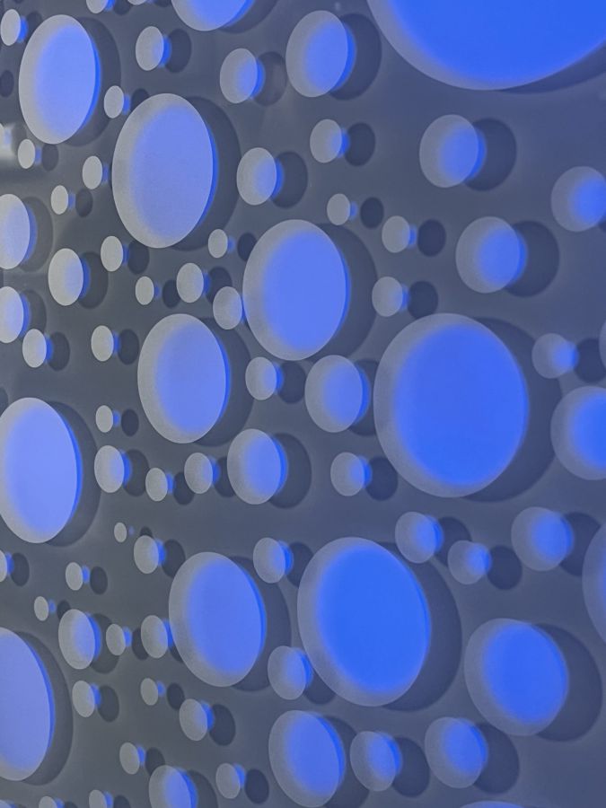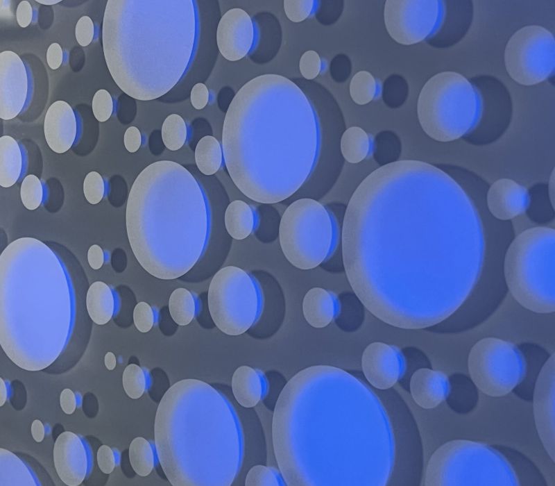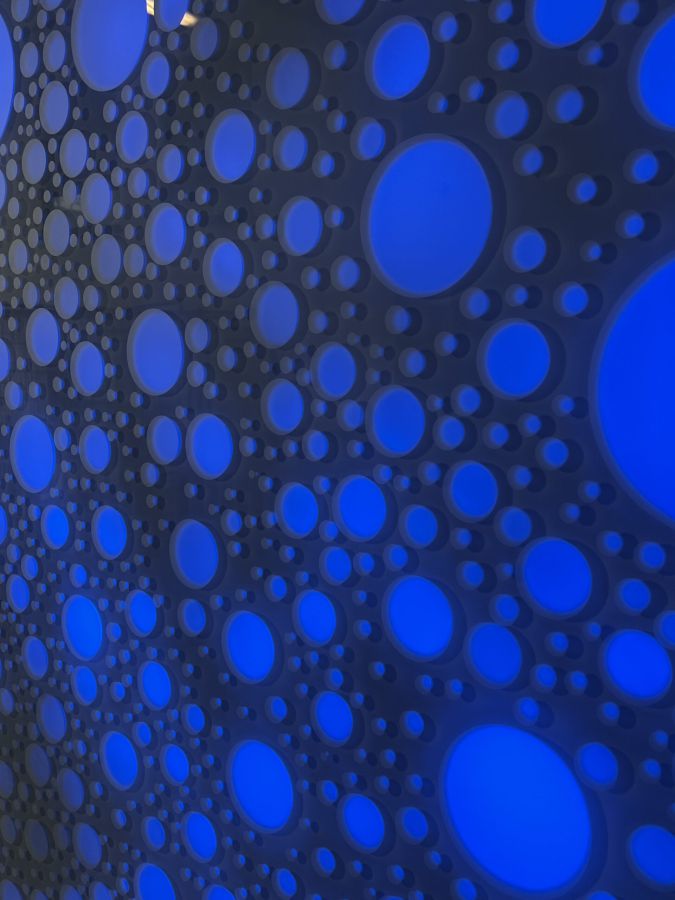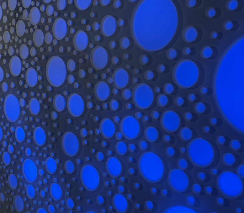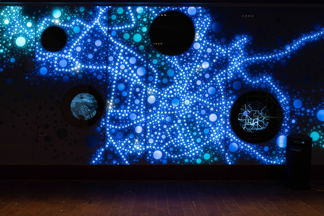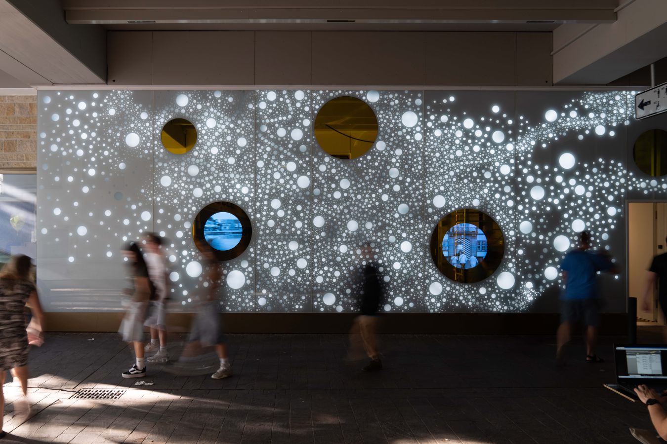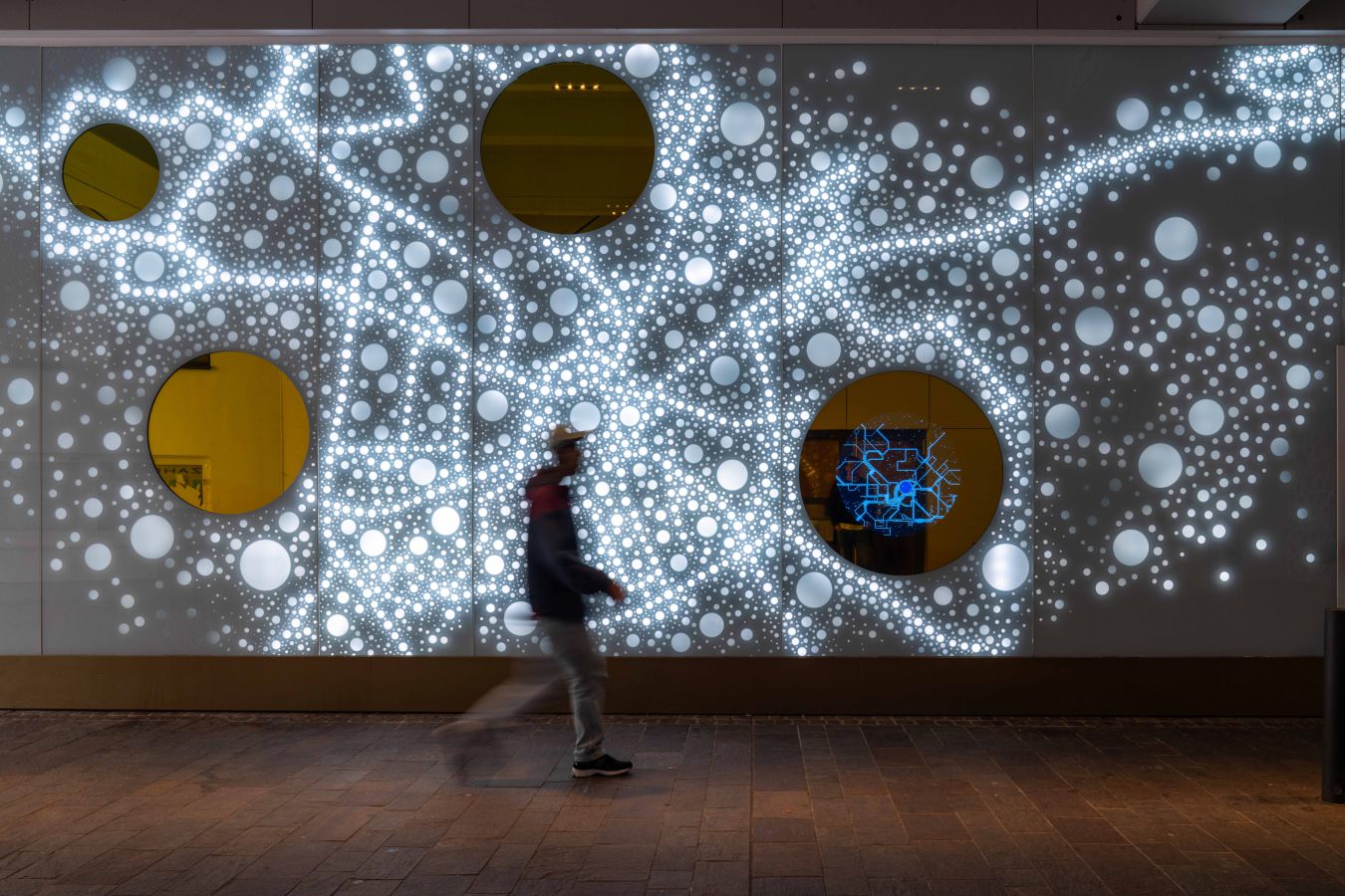 Die Lichtwand auf zwei Etagen der Brückengasse schafft einen Bezug zur Stadt und dem ÖPNV: Stadtplan, Buslinien und wichtige Orte in der Stadt werden verknüpft und all das in eine abstrakte Lichtzeichnung eingebettet, die einer Galaxie ähnelt. „Spots“ – goldene runde Spiegel, bündig in die Glasfläche eingelassen, verbergen Monitore, die bei Annäherung aktiviert werden und kurze Filme zu Hotspots der Stadt zeigen – in Verbindung mit Angaben zu den Buslinien, mit denen man diese Orte erreicht. In der Fläche wechseln weiße mit farbigen Lichtszenen ab – mehr oder weniger dynamisch in Abhängigkeit von Tages- oder Jahreszeit und besonderen Ereignissen. Die dynamische Hinterleuchtung, ein steuerbares LED-Lichtsystem, ermöglicht eine kreative Lichtgestaltung, mit der auch neue Lichtszenen noch Jahre später programmierbar sind.