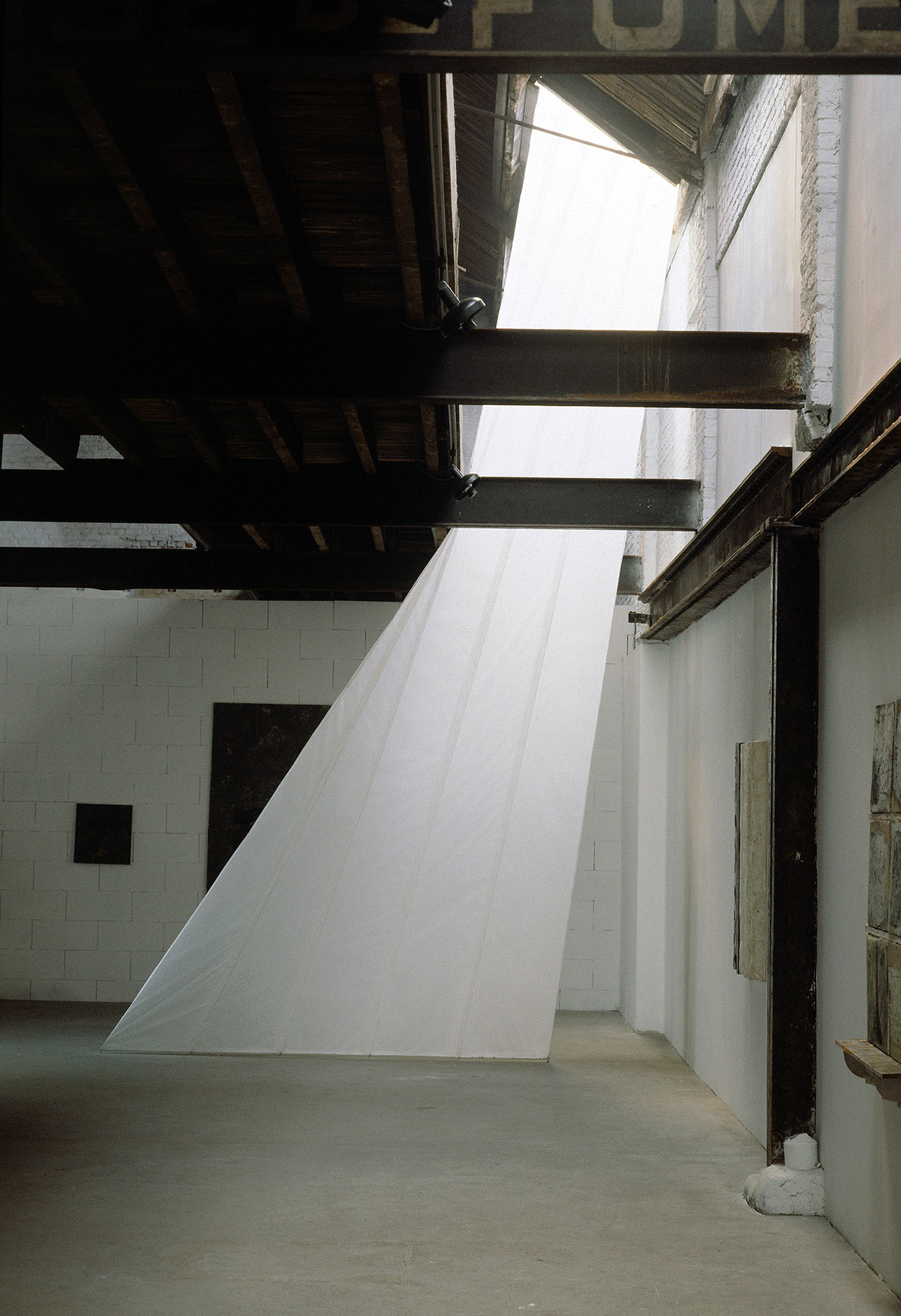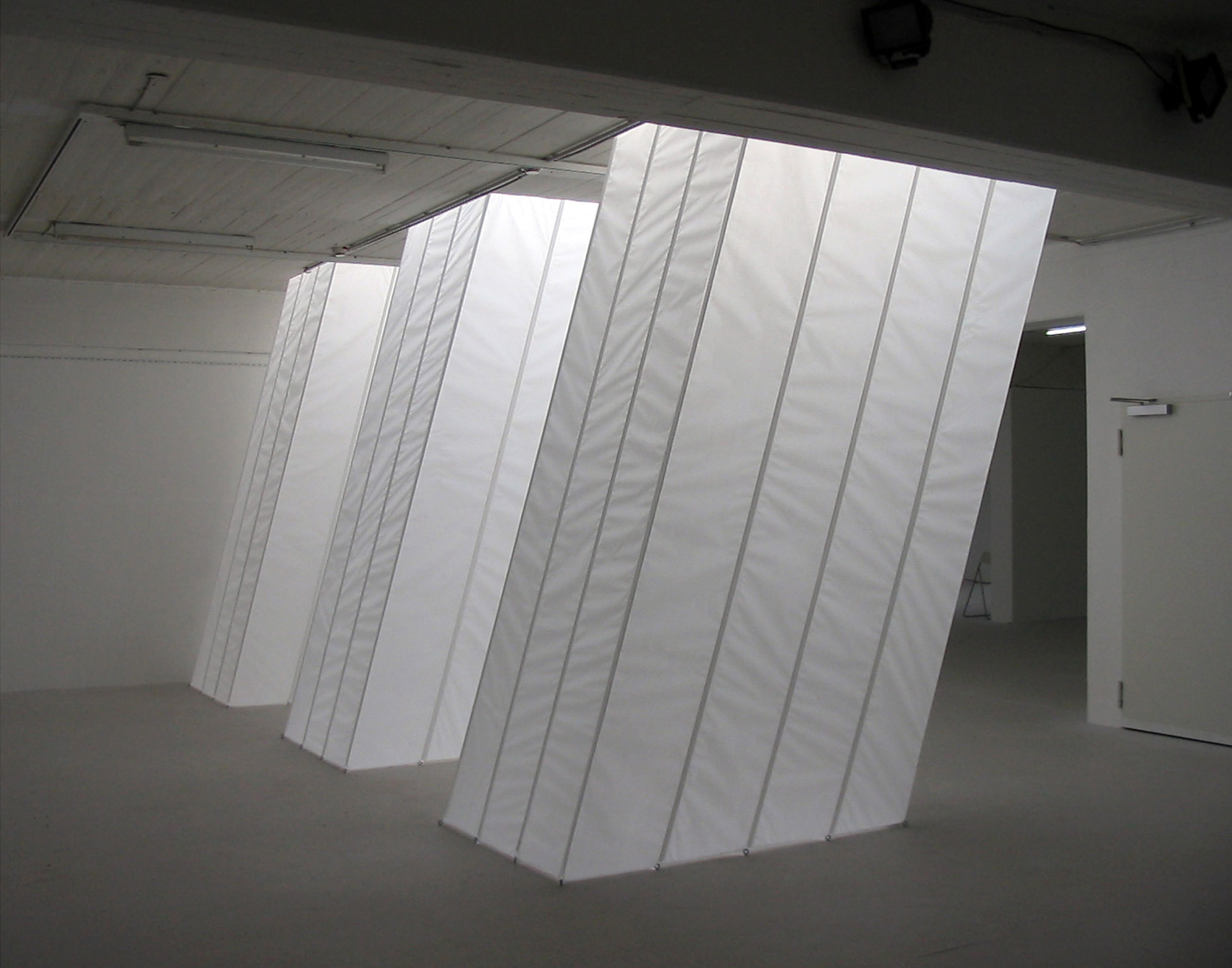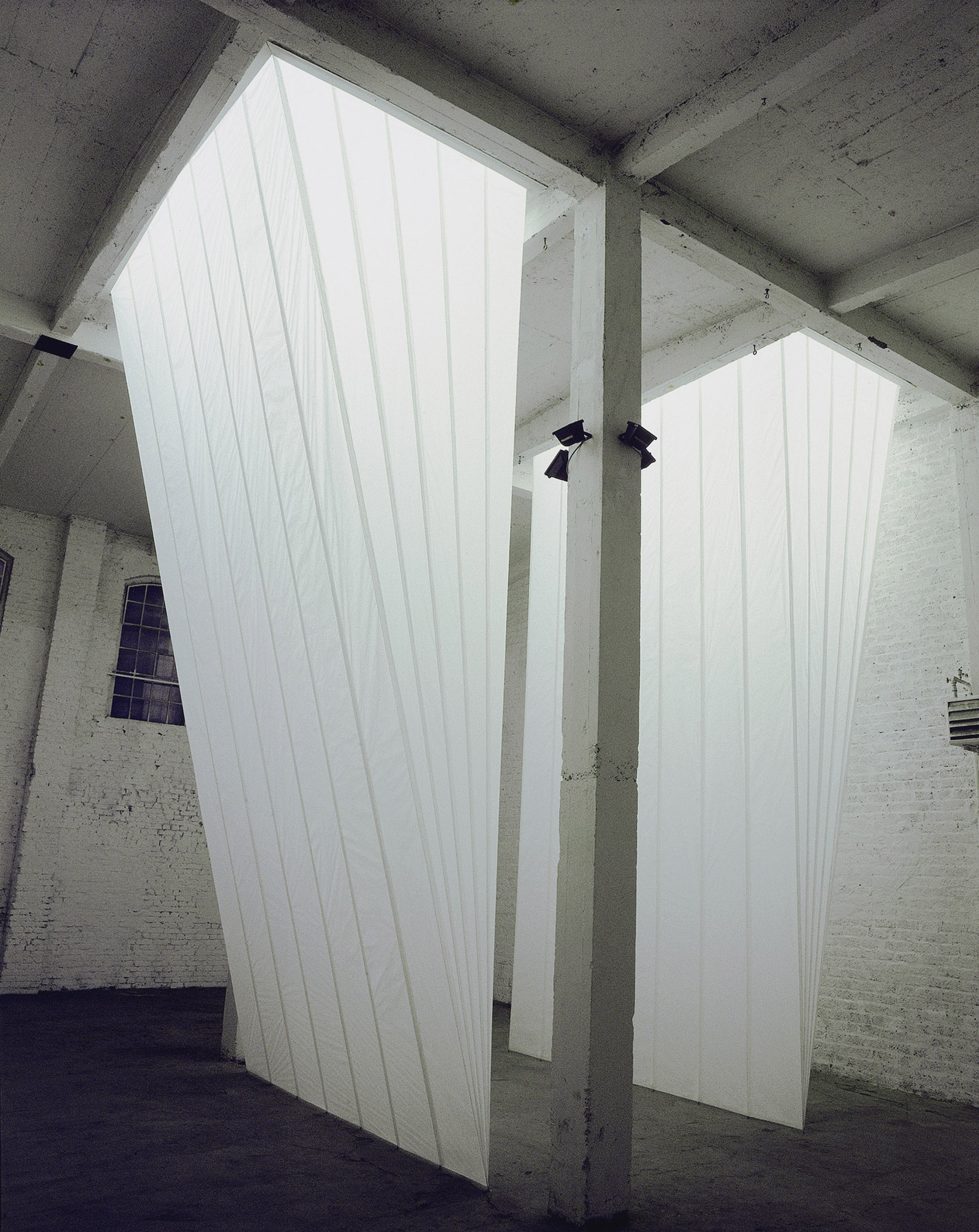 Papier, Stahlseil, Tageslicht, 3 Lichtformenje H 320 x B 165 x L 240 cm