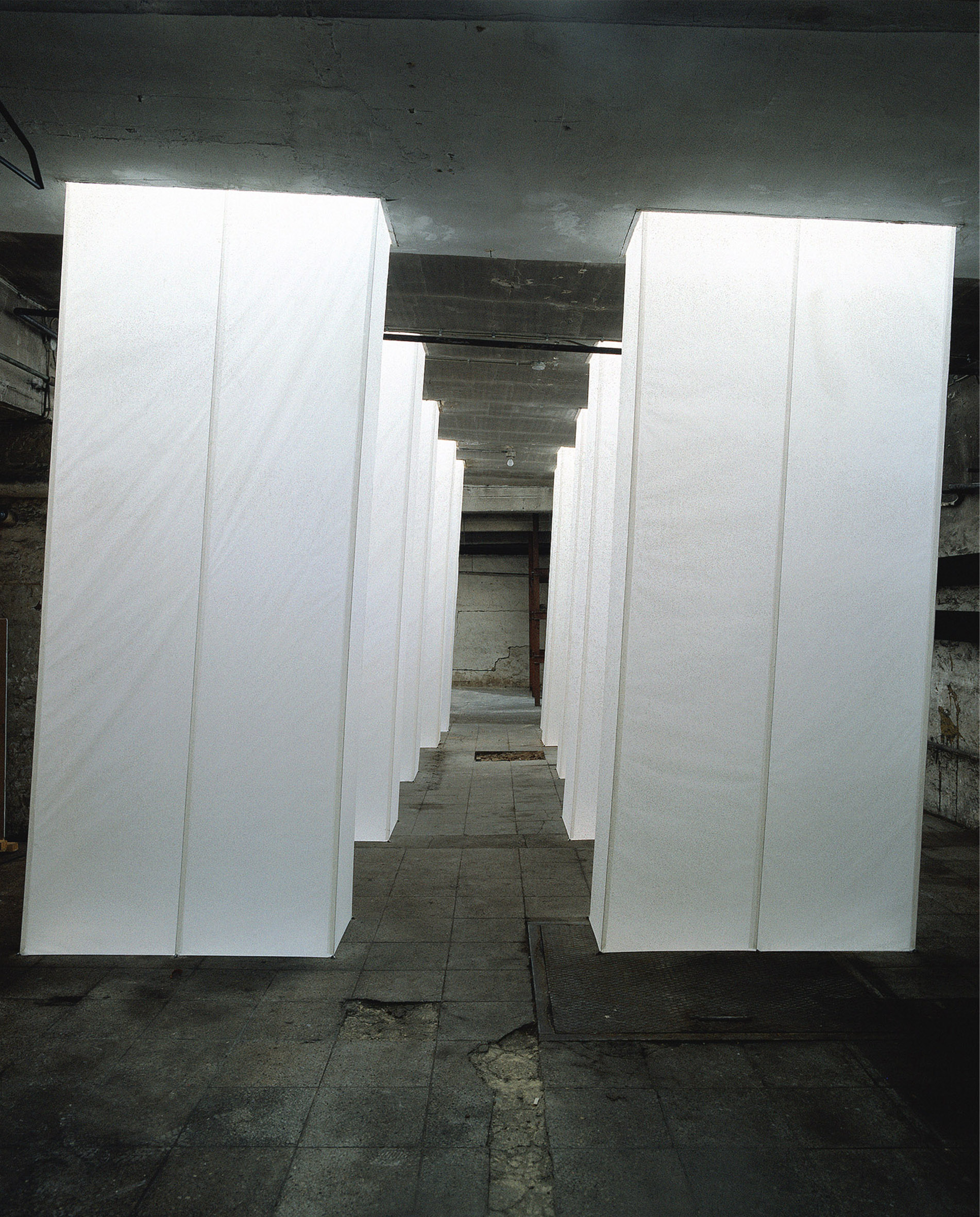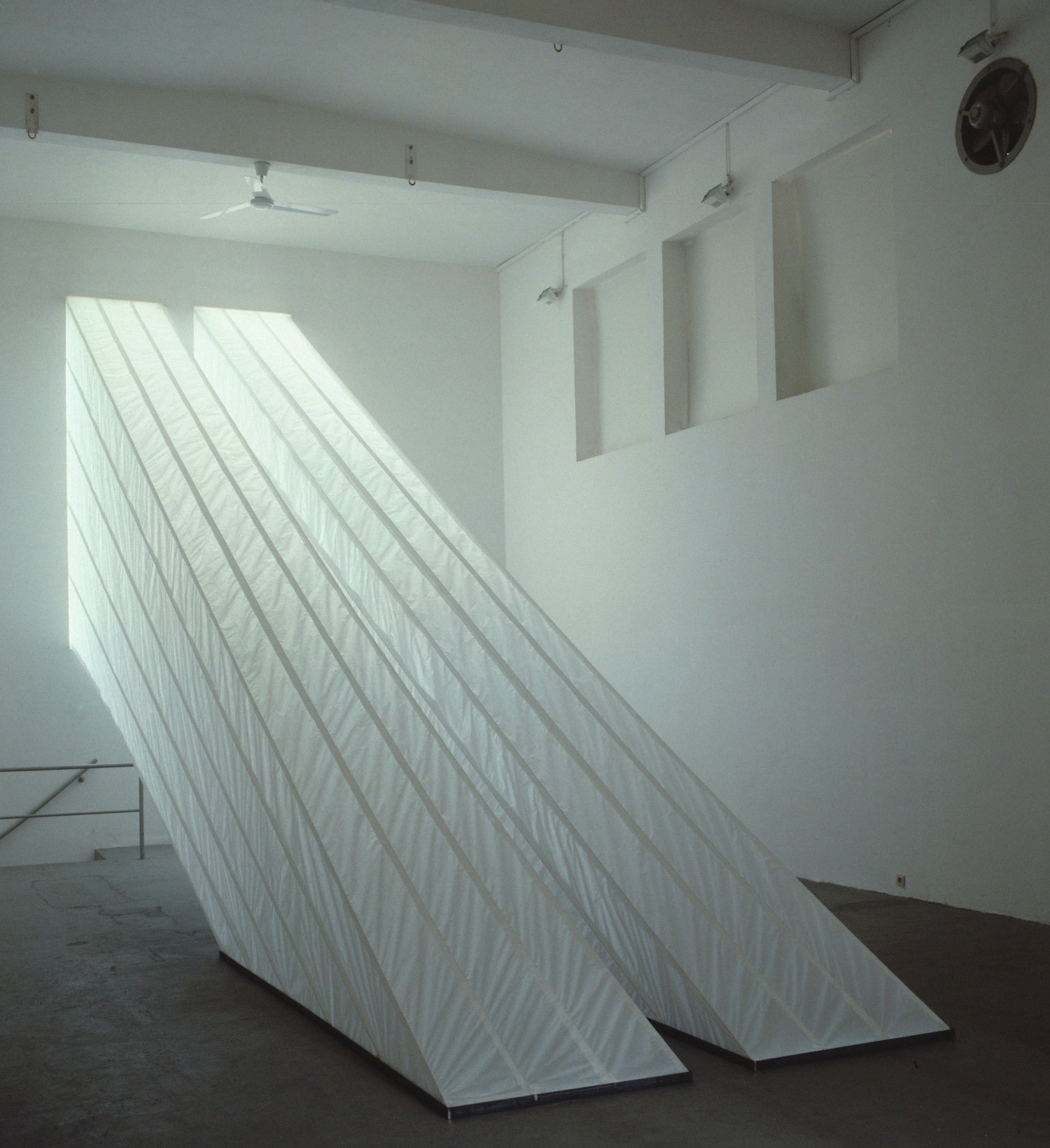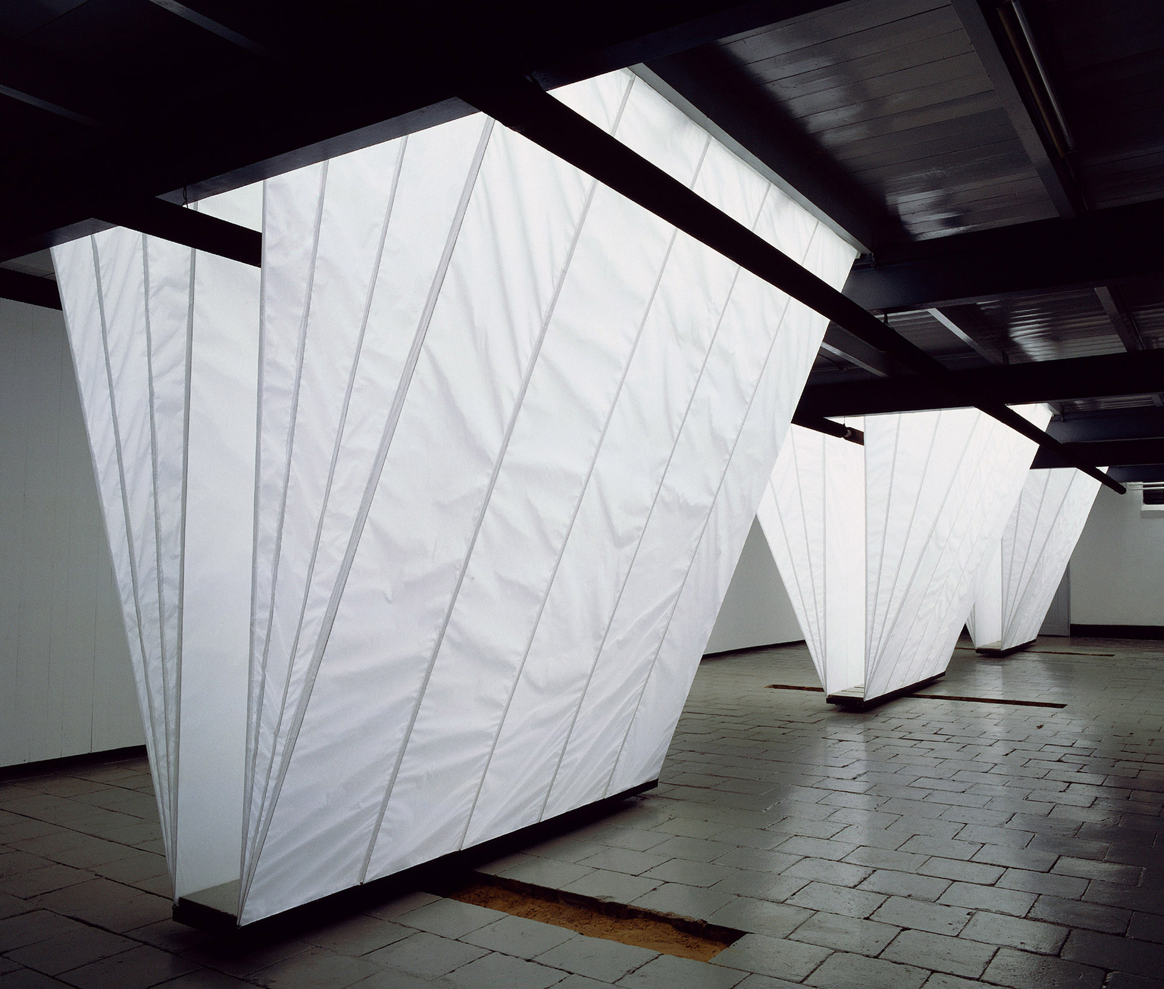 Papier, Stahlseil, Tageslicht, 8 LichtformenMaße jeweils ca. H 350 x B 45 x L 695 cm