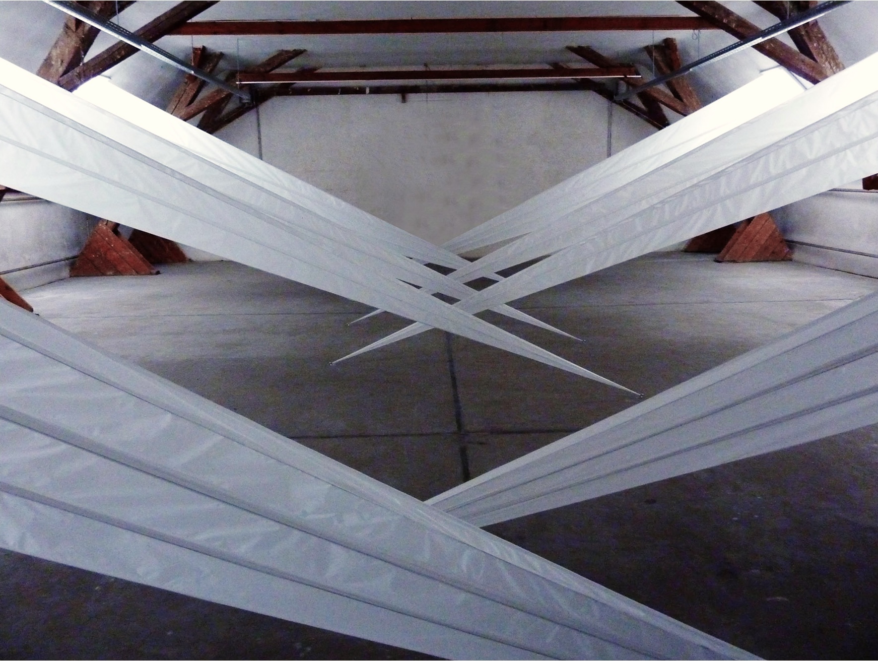 Papier, Stahlseil, Tageslicht,H 560 cm B 230 cm L 1050 cm