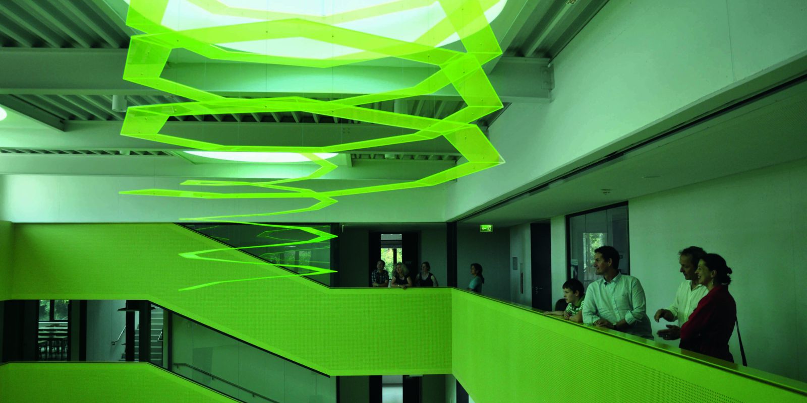 Tageslichtinstallation aus fluoreszierendem Acrylglas, Stahlseil