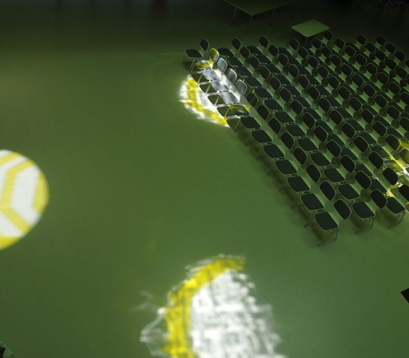 Die Lichtinstallation rückt das einfallende Tageslicht, welches durch Heliostate in das Bauwerk geleitet wird, ins Zentrum der Aufmerksamkeit. In drei verschieden hohen Spiralen (Neigungswinkel 4.5° / 3.75° / 3 °) wird der Lichteinfall optisch gefasst und das in die Spiralelemente eingestrahlte weisse Tageslicht wird als fluoreszierende leuchtende grüne Kontur sichtbar und in den Raum umgelenkt, abgestrahlt und gespiegelt. Dadurch werden verschiedene Phänomene im Raum sichtbar: Hell leuchtenden Lichtkanten, weiße Spiegelungen an Wänden und Decke, grüne Projektionen an Boden und angrenzenden Wänden innerhalb von runden oder ovalen weissen Lichtfeldern, die einem Scheinwerferlicht ähneln.