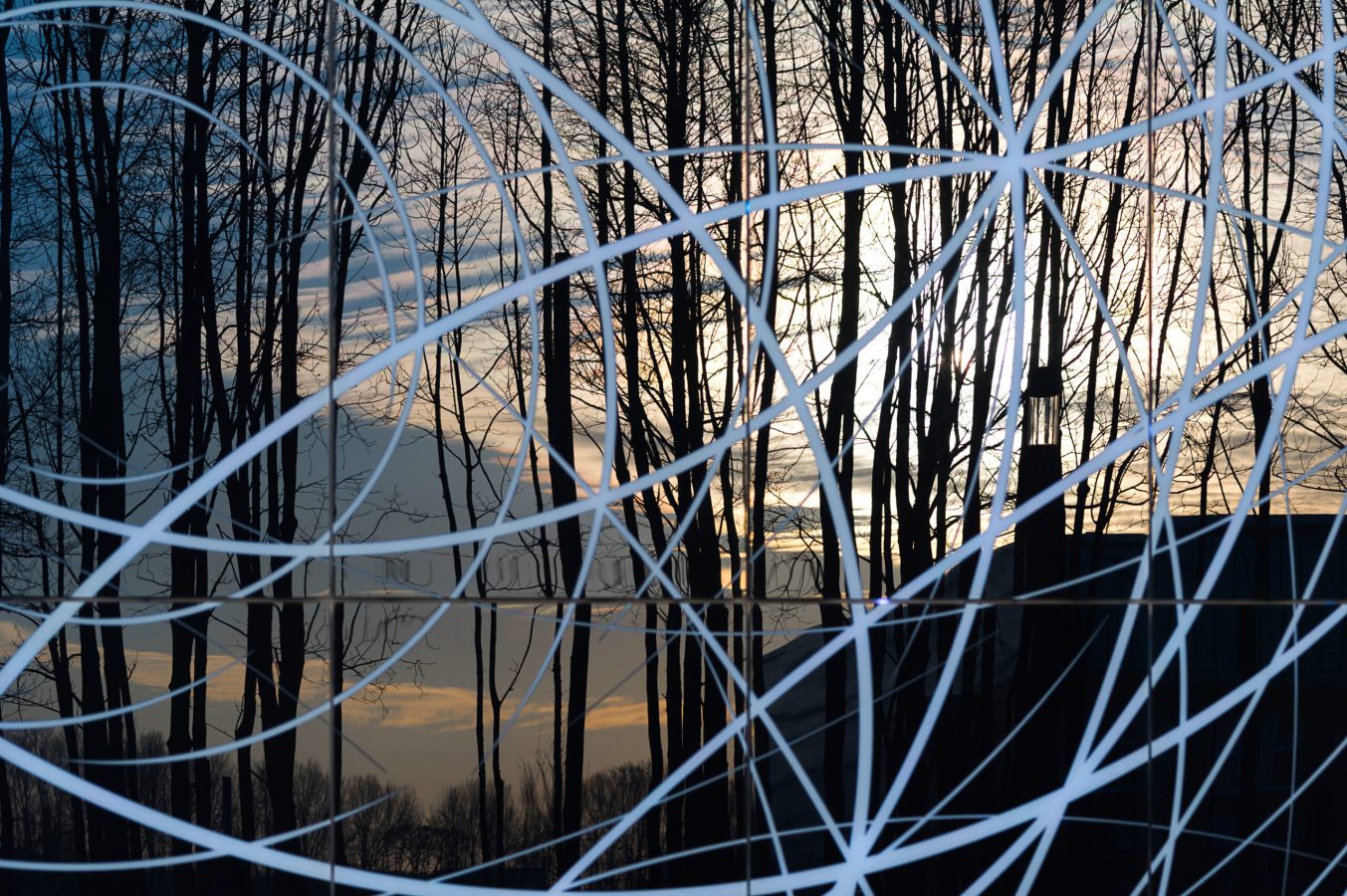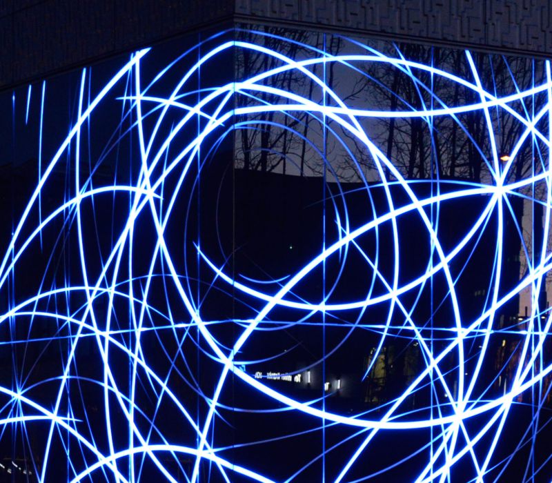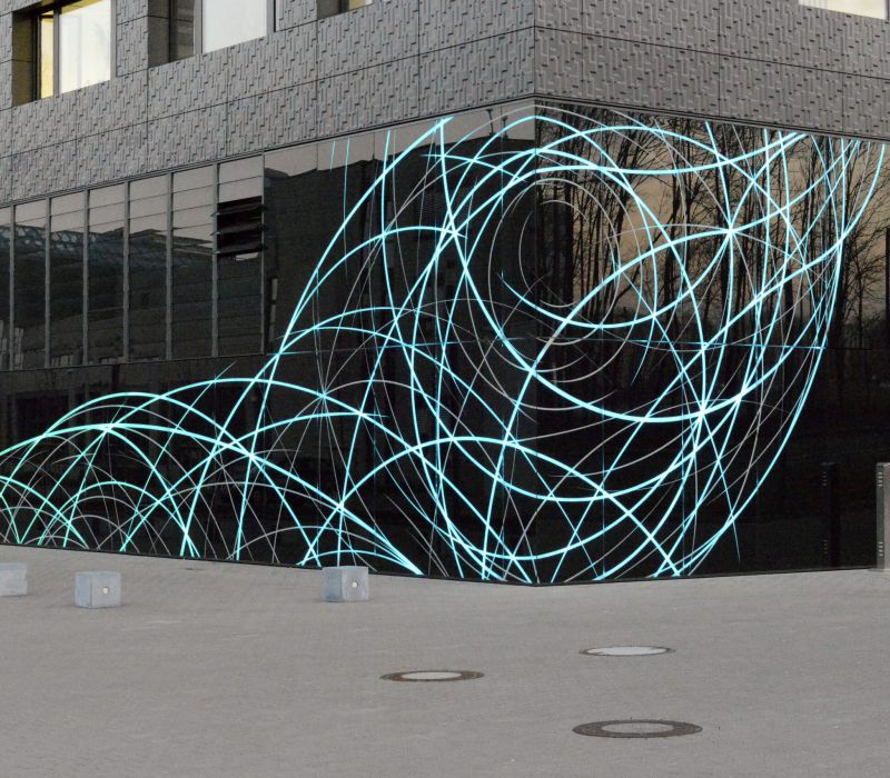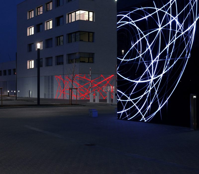 Zwei große Netzwerkzeichnungen sind in Richtung des neuen RWTH-Campus als weithin sichtbares Erkennungsmerkmal in die beiden Glasfassaden integriert worden. Die Zeichnungen werden durch Licht animiert und zu einem lebendigen, sich ständig verändernden Bild. Die Impulse für diese Lichtszenen kommen direkt aus den Instituten und zwar dadurch, daß das Lichtsystem an das Intranet der Institute gekoppelt ist. So werden die internen Aktivitäten in einer abstrahierten Form von außen sichtbar. Das Glas ist so bearbeitet, daß die Zeichnungen auch im hellen Tageslicht zu sehen sind und es zahlreiche interessante Ansichten gibt. Die Leitbilder beider Institute zeigen, das der Begriff des Netzwerks als grundlegende Arbeitsstruktur innerhalb der Teams große Bedeutung hat. Das Bild des Netzwerks auf der Fassade ist also – ähnlich dem eines neuronalen Netzwerks – eine Abstraktion dieser inneren Struktur.